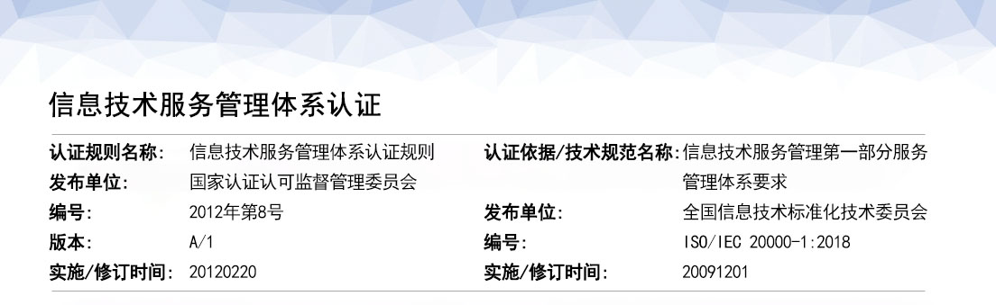 ISO 20000是面向機構的IT服務管理標準,目的是提供建立、實施、運作、監(jiān)控、評審、維護和改進IT服務管理體系(ITSM)的模型。建立IT服務管理體系(ITSM)已成為各種組織,特別是金融機構、電信、高科技產(chǎn)業(yè)等管理運營風險不可缺少的重要機制。ISO 20000讓IT管理者有一個參考框架用來管理IT服務,完善的IT管理水平也能通過認證的方式表現(xiàn)出來。