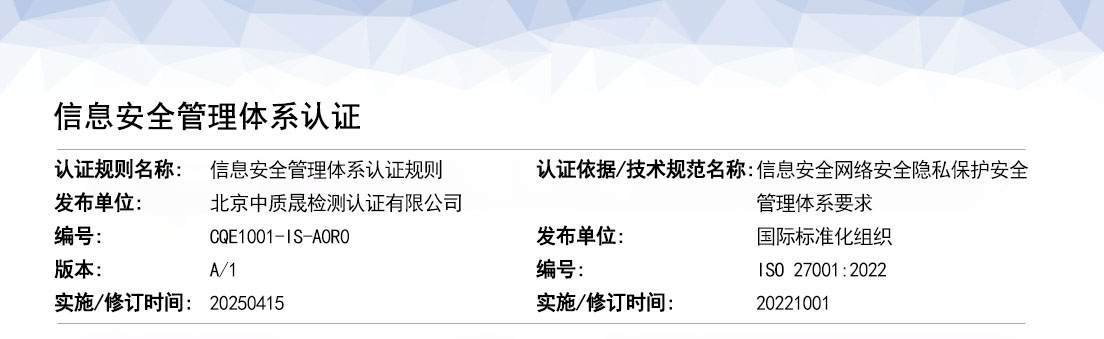 信息安全管理體系標(biāo)準(zhǔn)(ISO27001)可有效保護(hù)信息資源,保護(hù)信息化進(jìn)程健康、有序、可持續(xù)發(fā)展。ISO27001是信息安全領(lǐng)域的管理體系標(biāo)準(zhǔn),類似于質(zhì)量管理體系認(rèn)證的標(biāo)準(zhǔn)。當(dāng)您的組織通過(guò)了ISO27001的認(rèn)證,就相當(dāng)于通過(guò)ISO9000的質(zhì)量認(rèn)證一般,表示您的組織信息安全管理已建立了一套科學(xué)有效的管理體系作為保障。